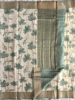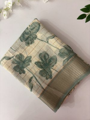 Mustard Printed Tussar Silk Saree with Neem Zari Work
