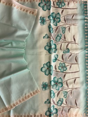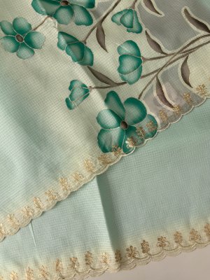 Light Turquoise Blue Supernet Saree with Aari Work